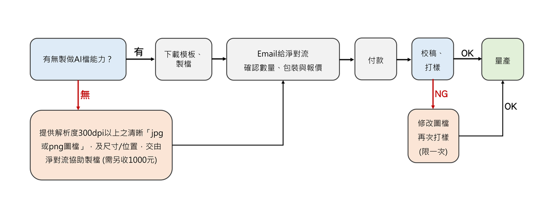 - 若無法製作AI檔,可提供解析度300dpi以上之jpg或png檔,由淨對流協助製檔,將收取1000元代客製檔費。