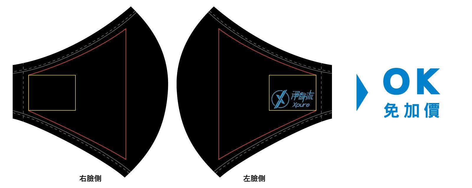 口罩的正面,表布固定是黑色的細菱格紋透氣布料,左右兩側則開放印刷,製檔方式如以下說明。
