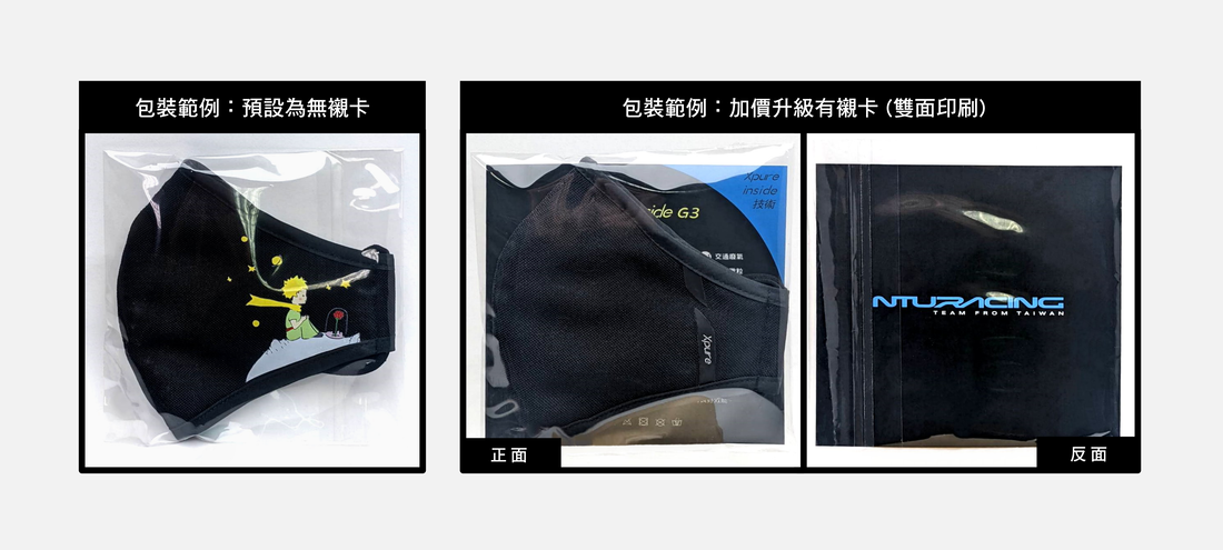 「半客製化」雖使用All-fit G3口罩為基底,但「一般客製化」口罩可變換的型式是多元的唷!可用不同款式口罩為基底,也可以更換表布、裡布,甚至是版型,圖案也可以改成網印、電繡或是硬式標。可參考我們為多家品牌客製化口罩或頭巾的 範例頁面。歡迎有興趣的品牌、活動承包商、機關團體等與我們聯繫洽談:service@xpure-tw.com