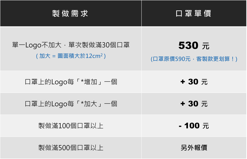 - 註3:價格範例:訂製100個口罩,口罩兩側皆印刷小於12cm2的圖樣,則口罩單價為 530 - 100 (滿100個) + 30 (多一個圖) = 460元,總價為 460元 x 100個 = 46,000元。