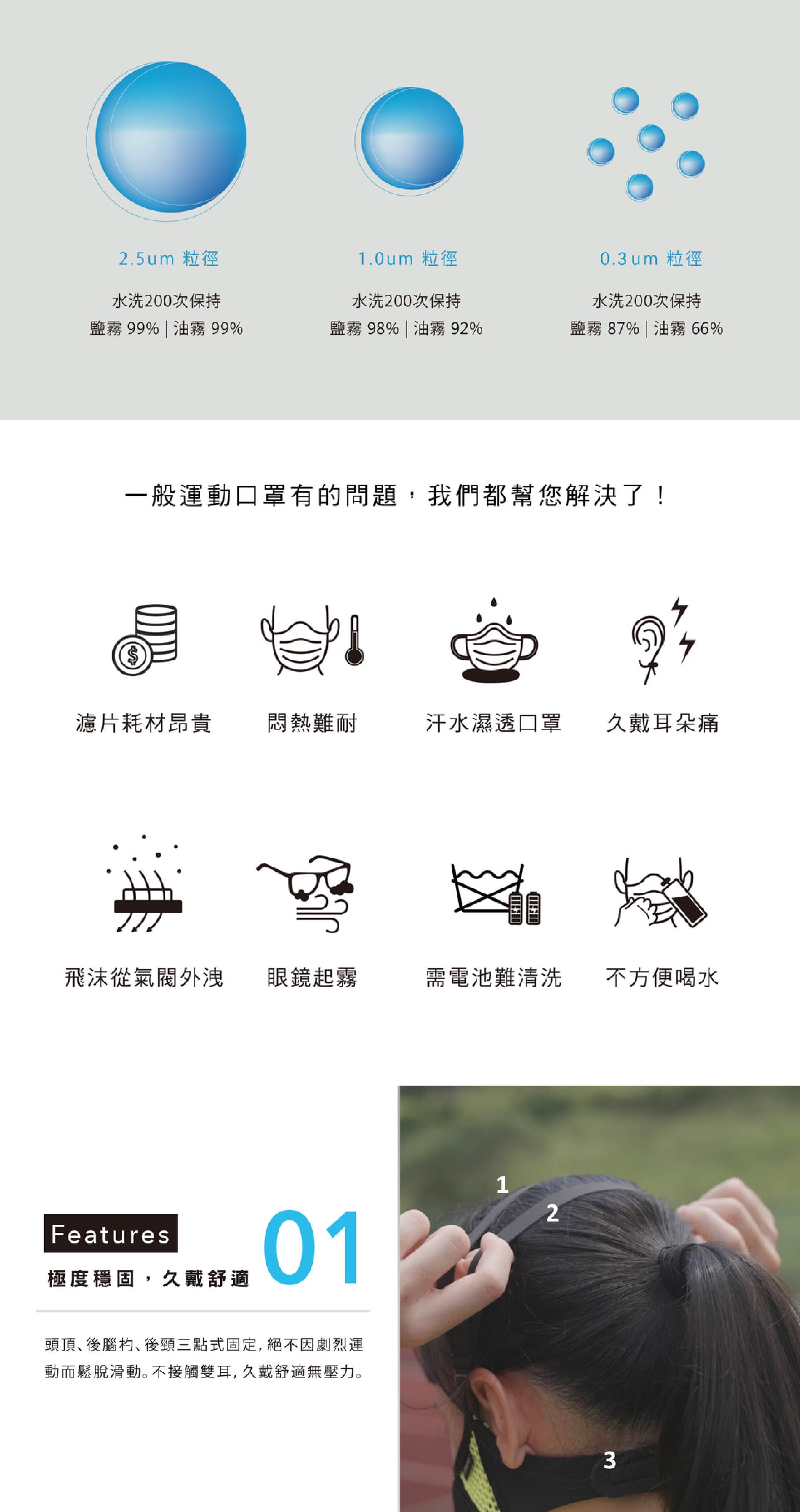 另外,並非洗200次後就立刻失效。只是因為水洗到200次時濾效會大概降到CNS15980抗霾認證的最低等級,因此我們只宣稱到200次。事實上,濾效的下降是漸進而緩慢的。舉例來說,新品濾效100分,洗200次後是60分,超過200次後是59、58、57分慢慢降,不是一下子降到0分。而一般生活用品店賣的低價布口罩,相對濾效只有不到10分,醫用口罩則因為氣密差是50分。換句話說,就算洗到200次,單看綜合濾效還是比這些口罩好一些唷!