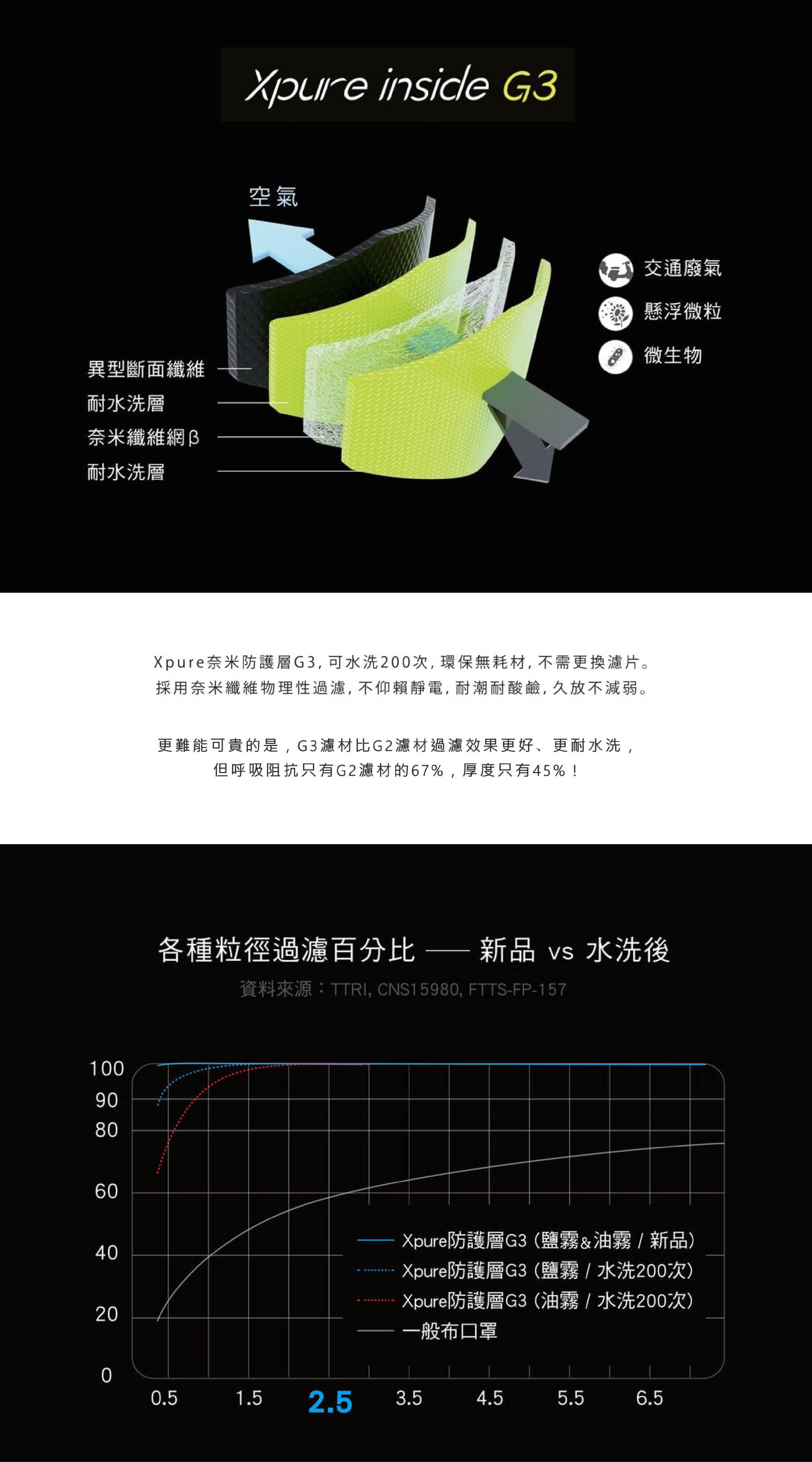 - 採用Xpure inside G3濾材,更透氣、更強效、更耐水洗