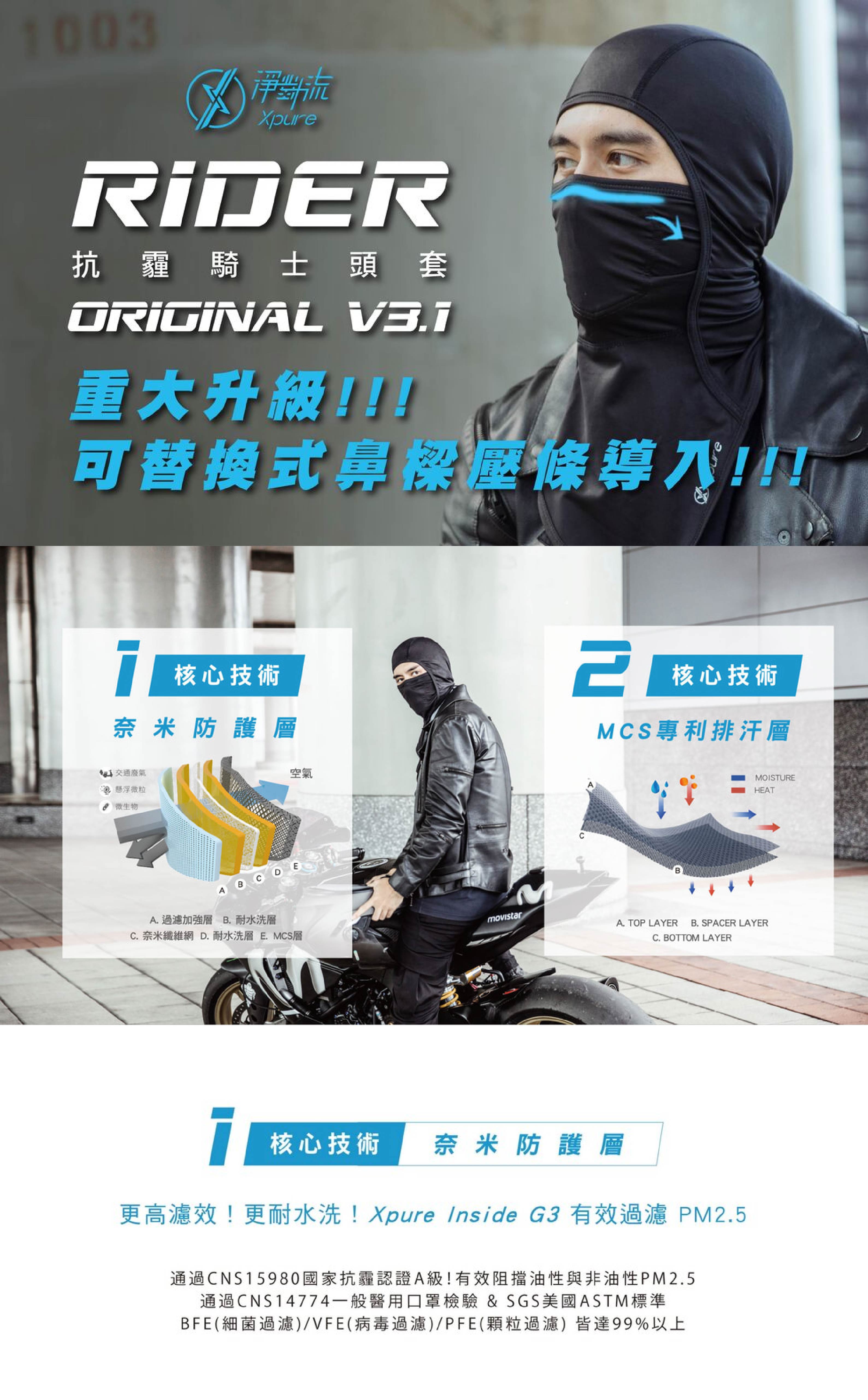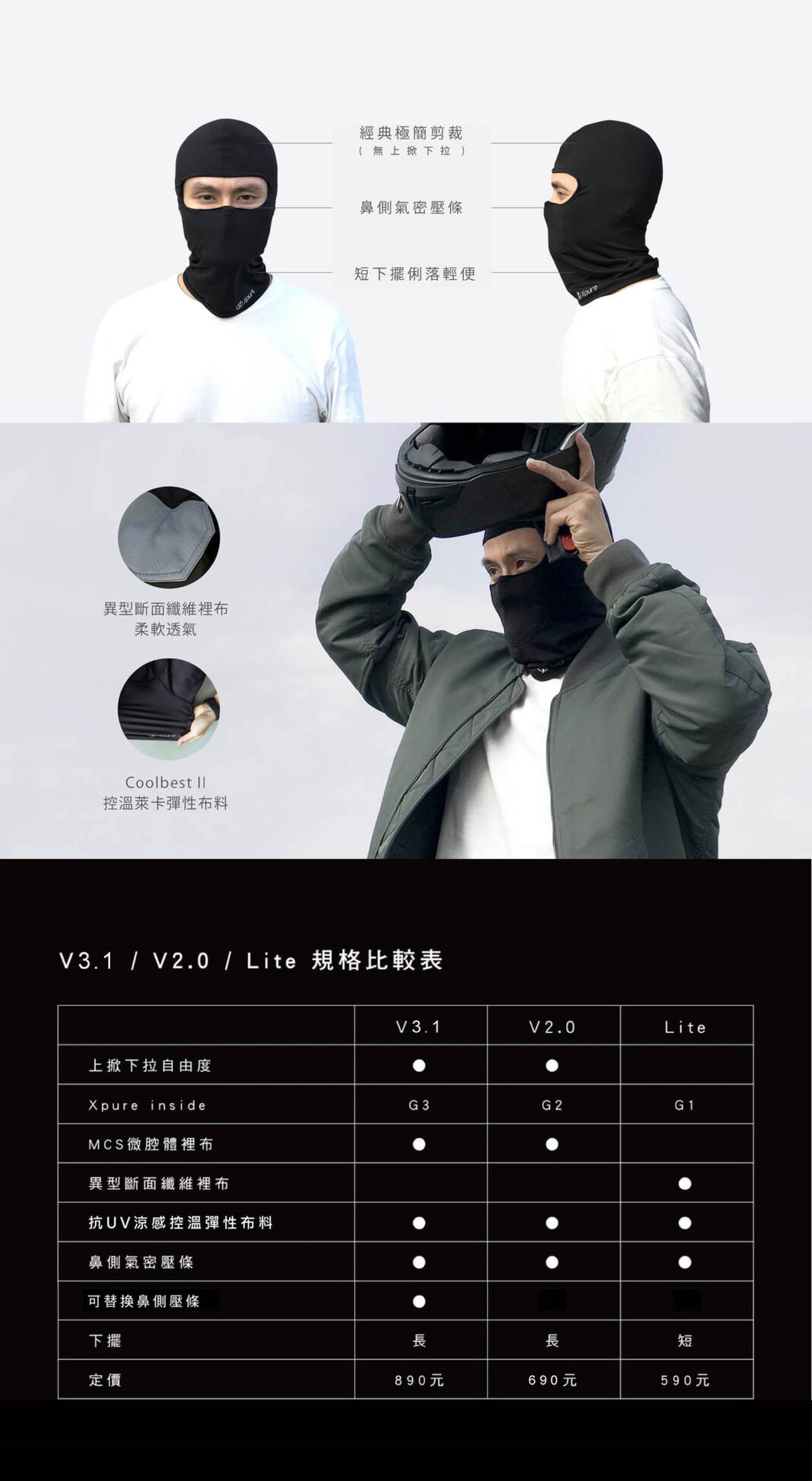 V3.1版使用Xpure inside G3,V2.0版使用G2,Lite版使用G1,過濾效果則是G3 > G2 > G1。而不論V3.1版、V2.0版或Lite版,都有鼻側壓條,因此氣密性會比沒有鼻側壓條的魔術頭巾好一些,與口罩則是差不多。