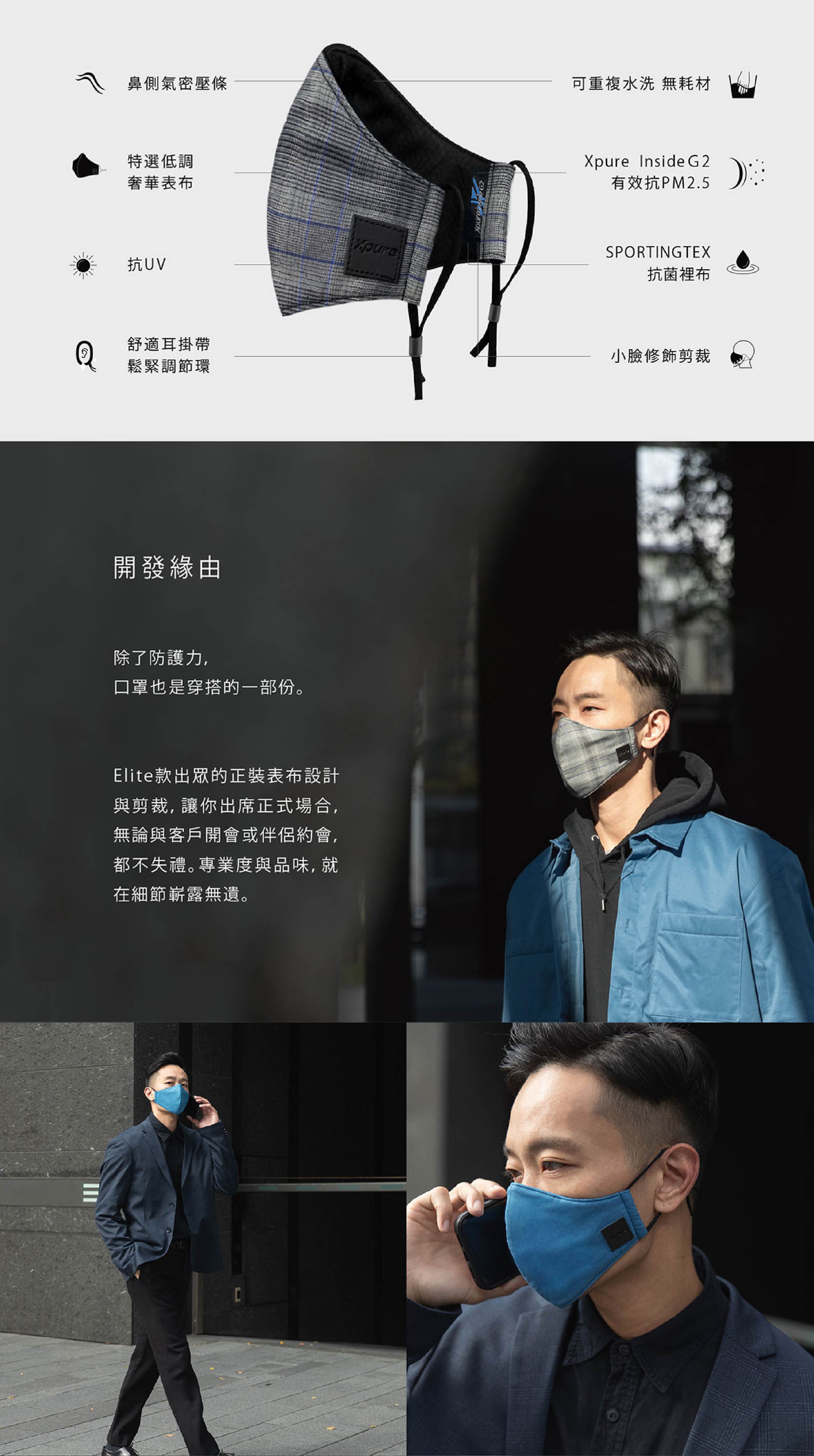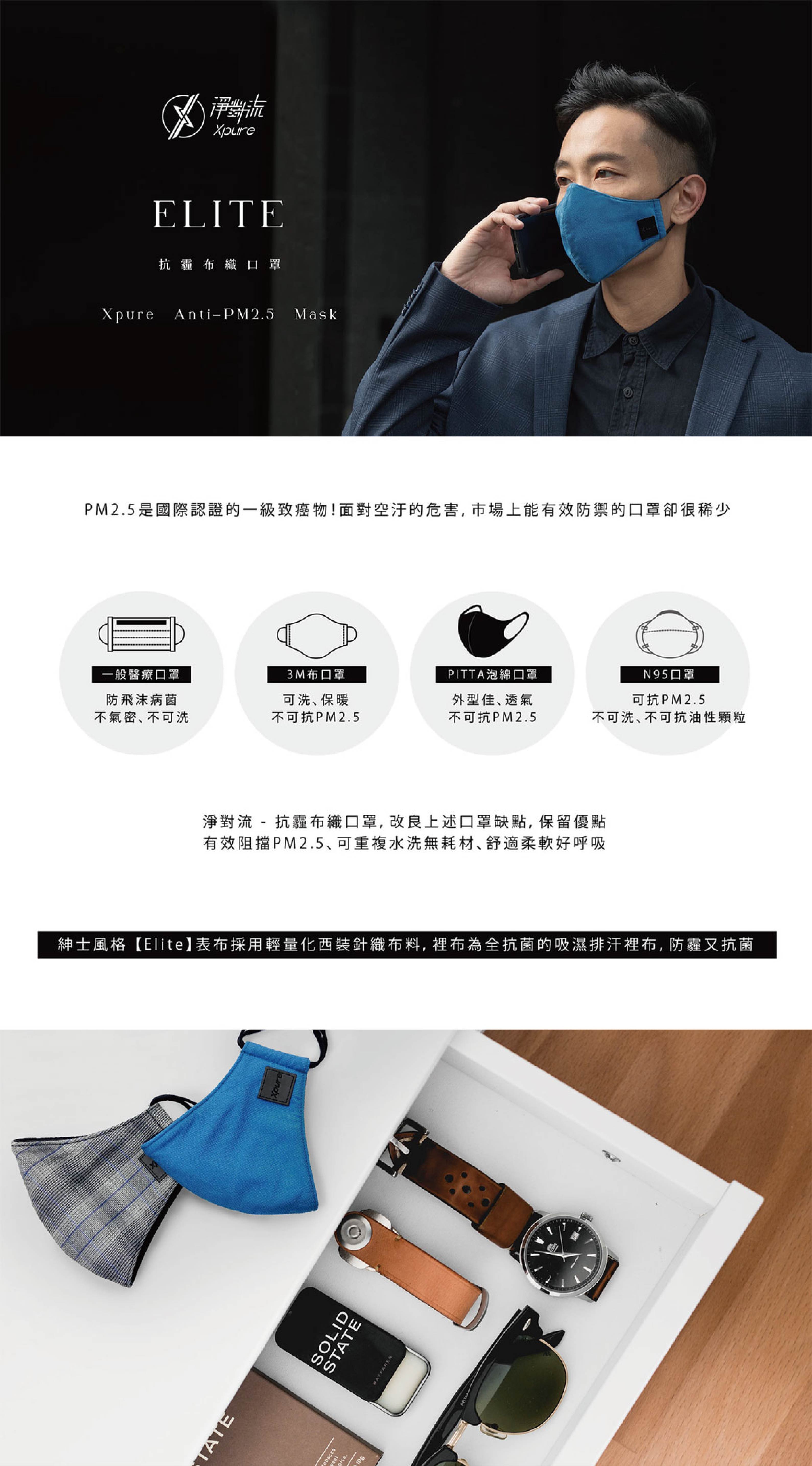 Elite款屬於Xpure inside G2濾材,因此與淨對流之All-fit款、Beauty款、Urban款屬同等級之濾效,皆能有效過濾PM2.5,達CNS15980國家抗霾標準B級,並可重複水洗200次依然維持良好效能,環保無耗材,保護自身之餘,也降低對環境的污染。