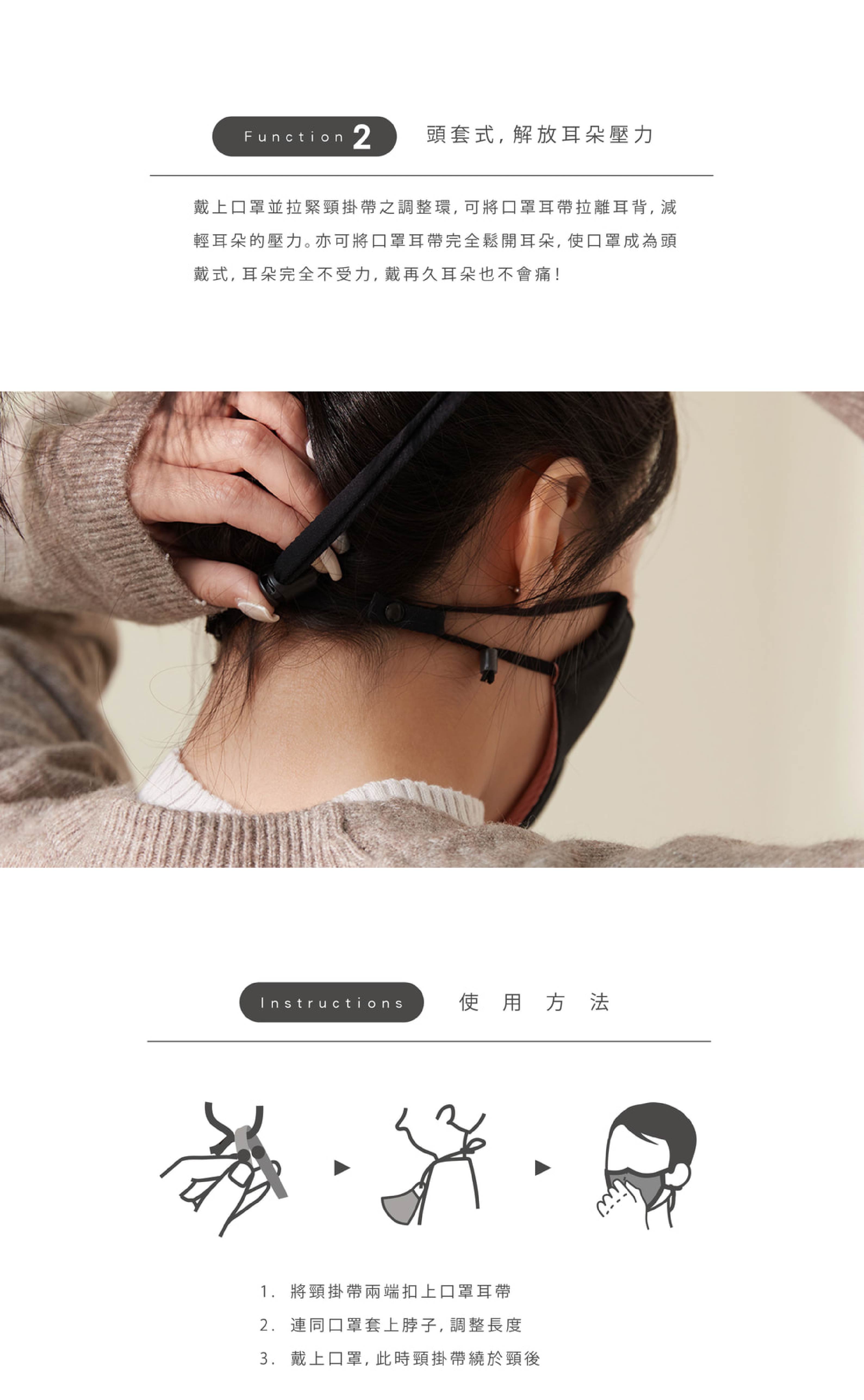 - 戴上口罩並拉緊頸掛帶之調整環,可釋放耳朵壓力。亦可將口罩耳帶完全鬆開,使口罩成為頭