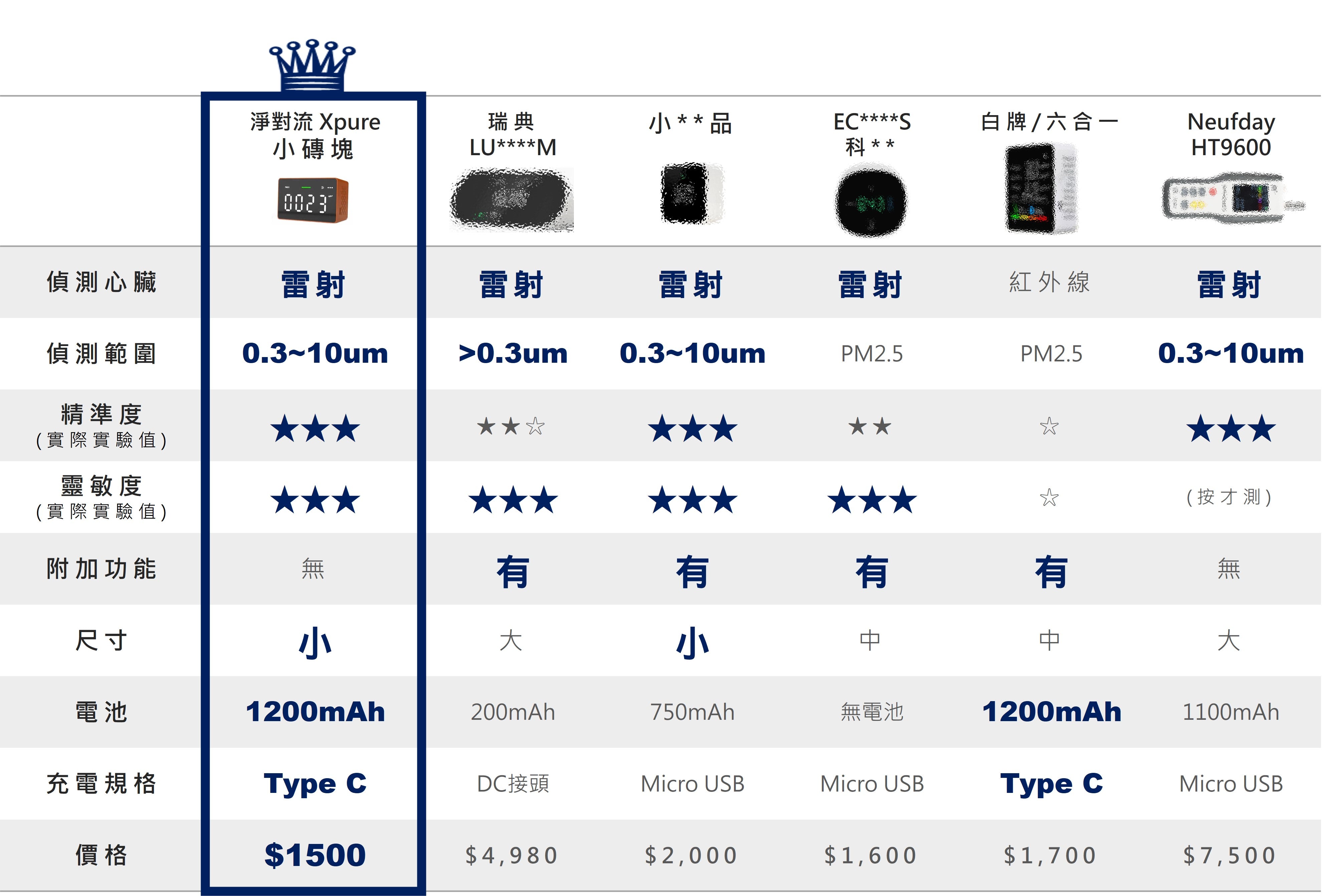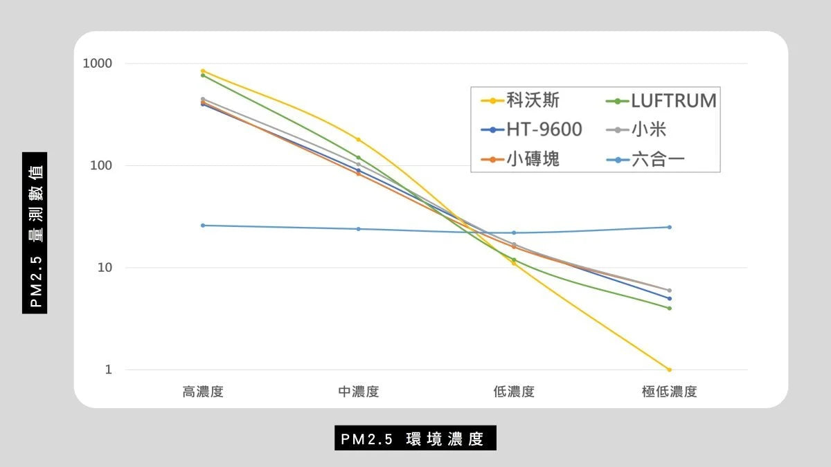 我們買了網路聲量較高的幾款空氣偵測器,並搭配相對高階的微粒計數器(HT9600)進行密閉空間微粒偵測實驗,從PM2.5高濃度測到低濃度,以下為實驗影片與比較圖表: