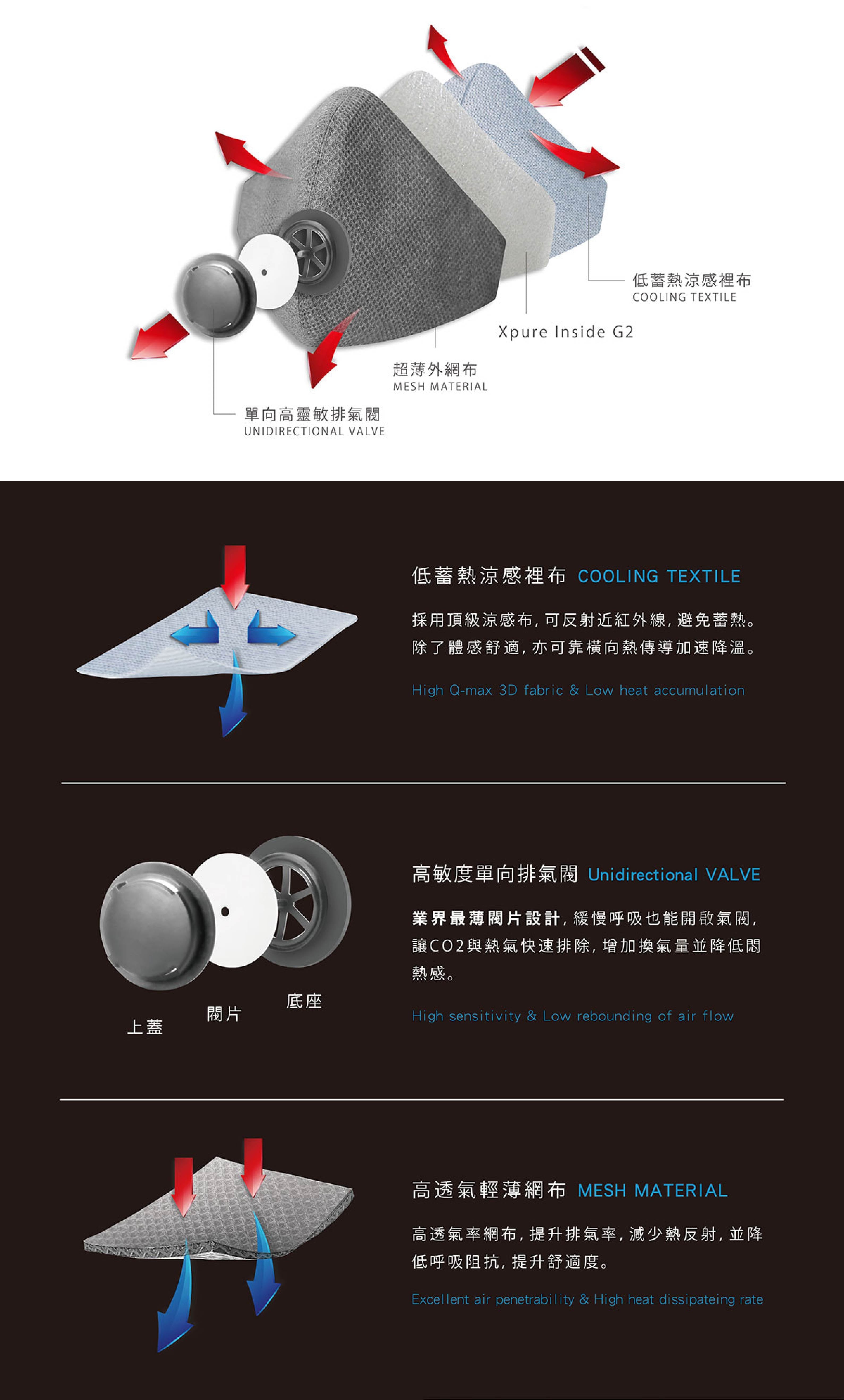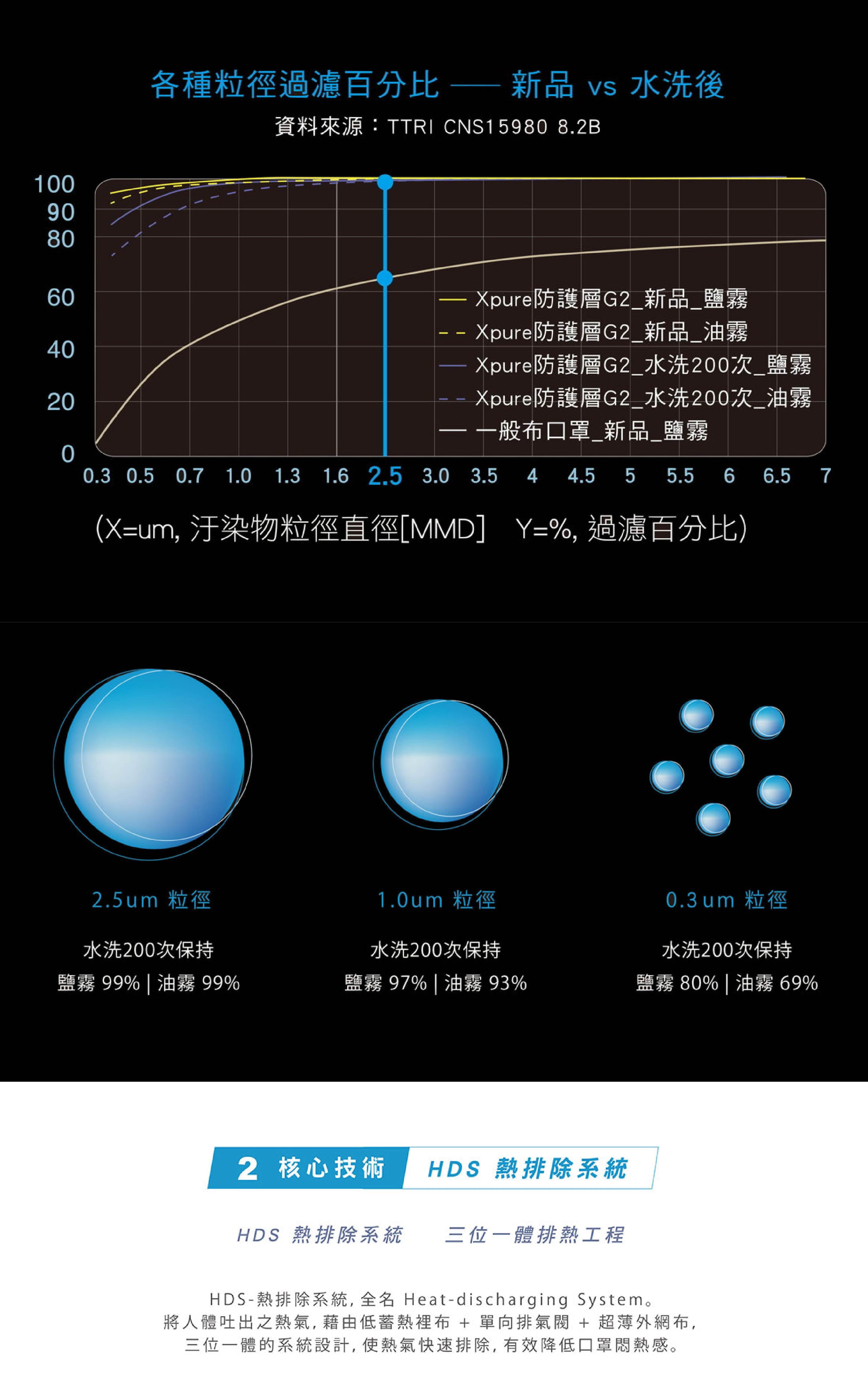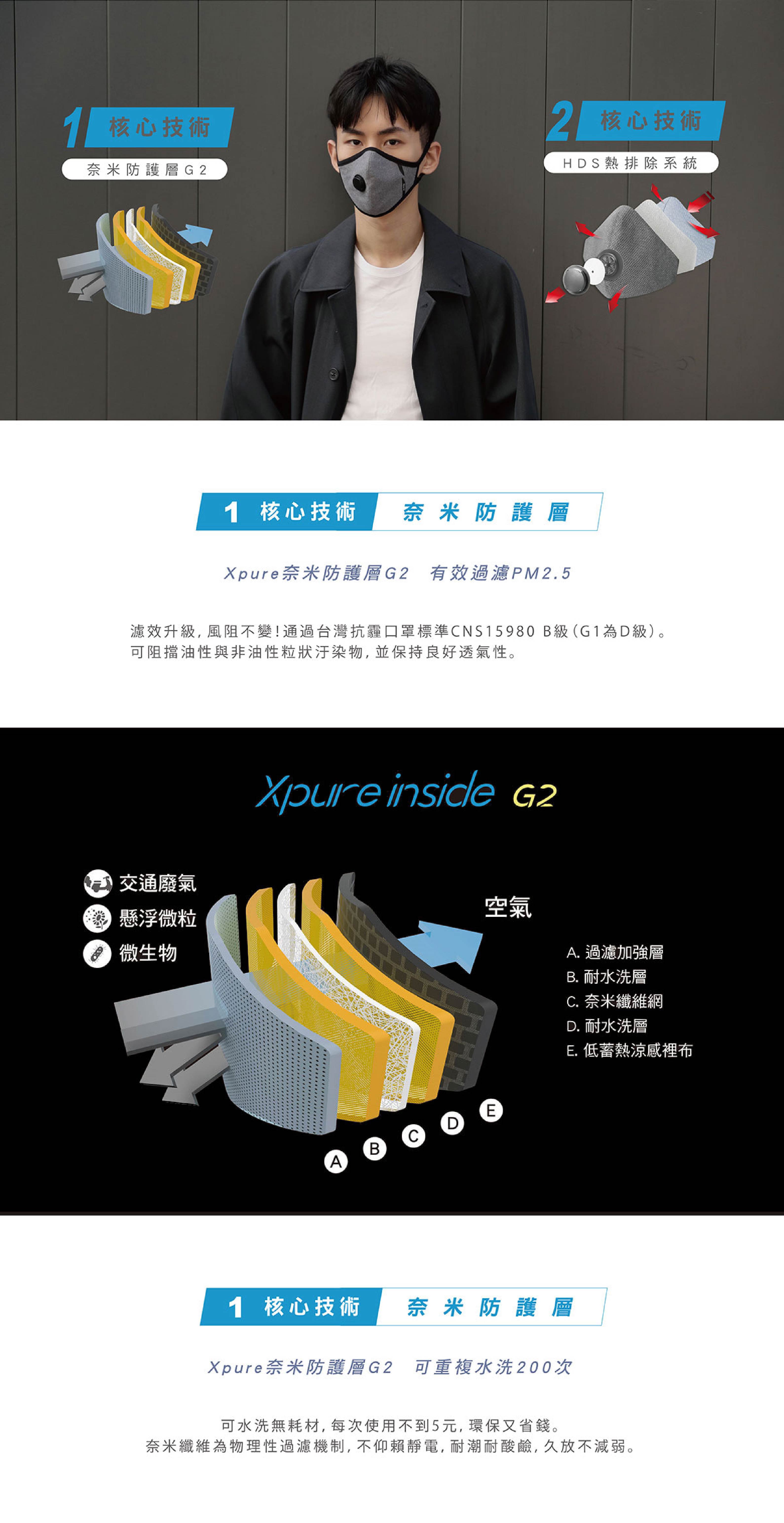 Urban款、All-fit款和Beauty款三款使用相同的Xpue奈米防護層G2,都是通過CNS15980 B級,因此在過濾效果上是相同的,當然也同樣能承受水洗200次唷!而基本款使用的是G1濾材,通過CNS15980 D級,在防護效果上稍差,但在一般環境下使用也是足夠的。