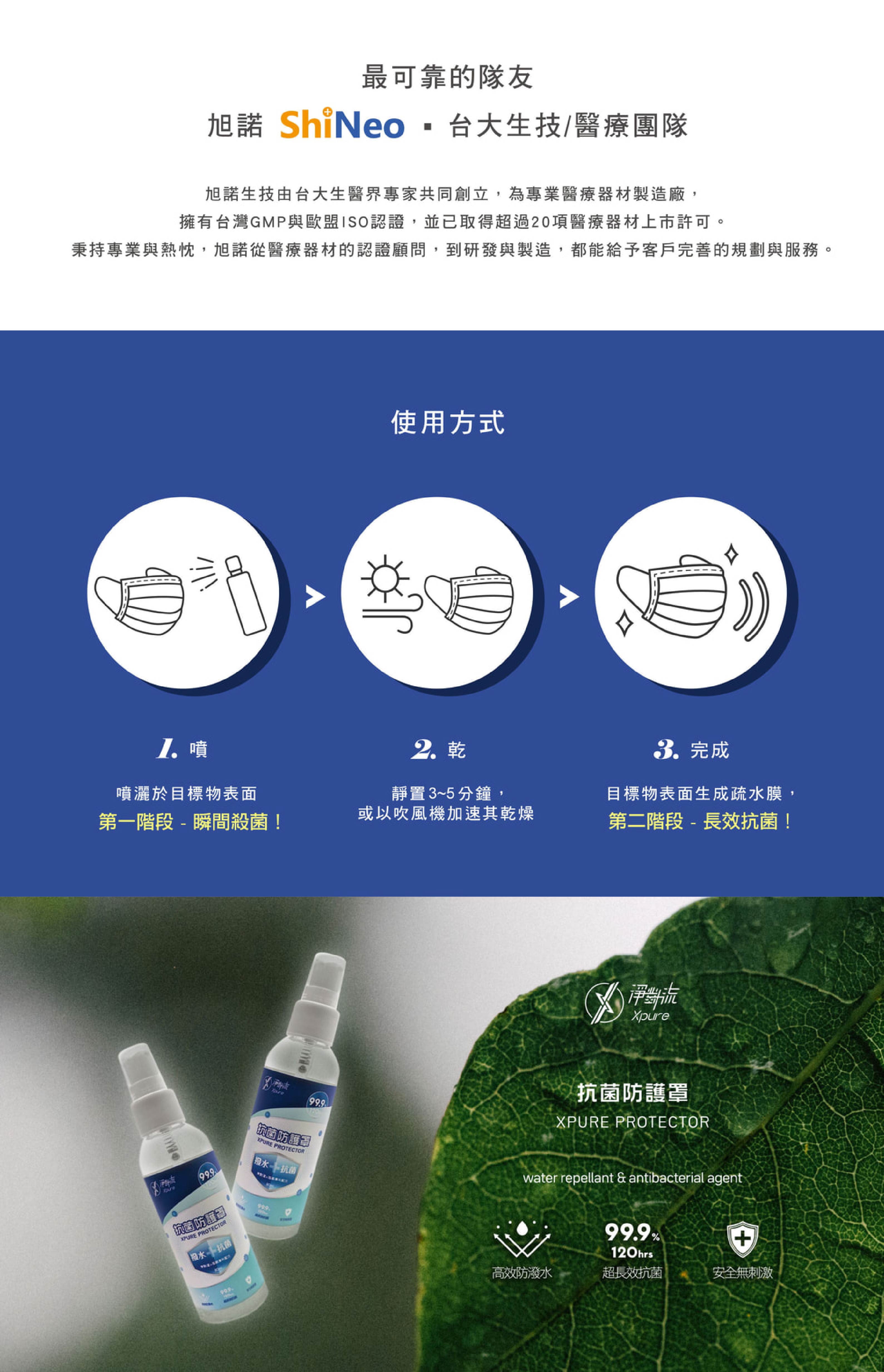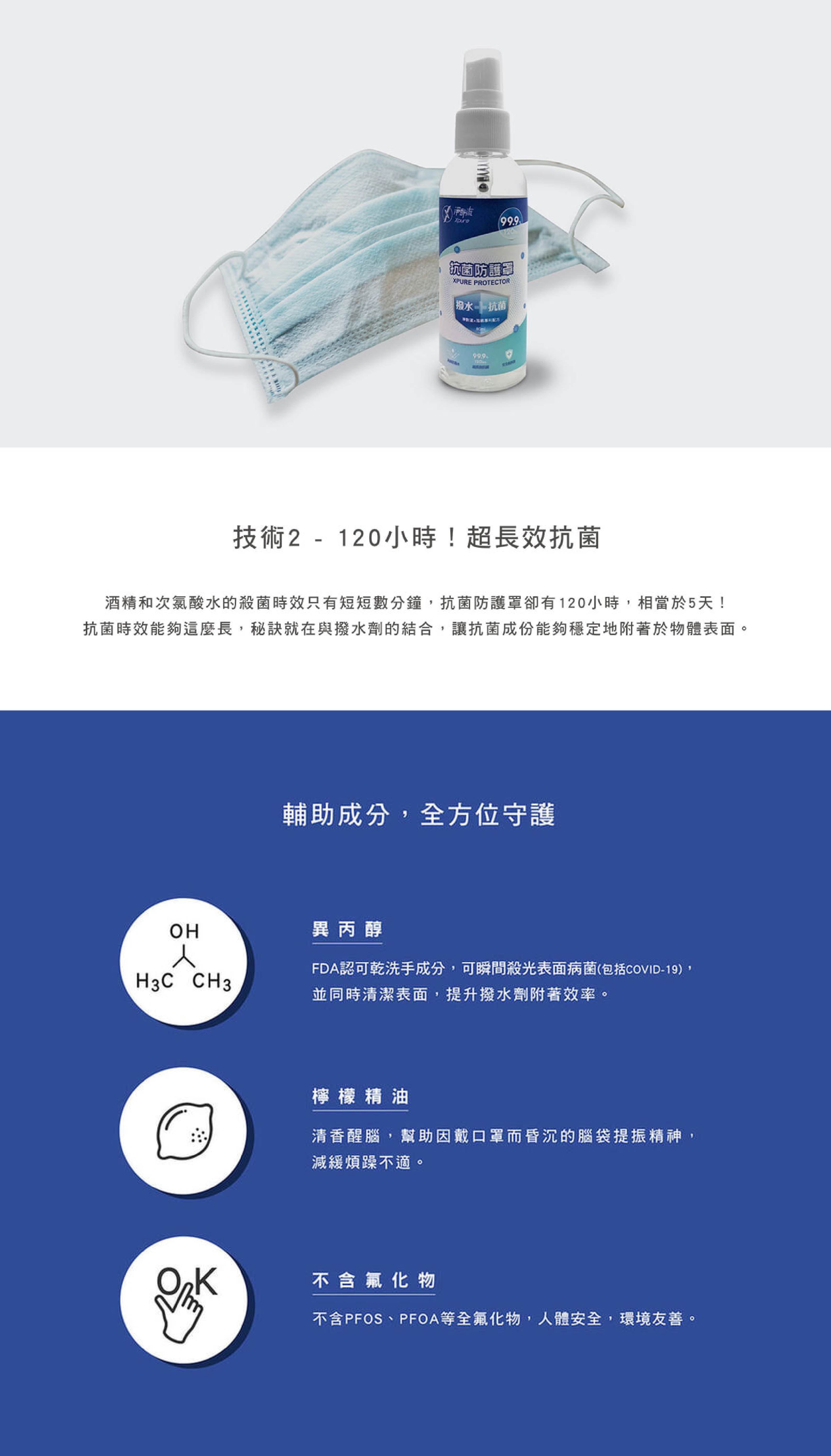 - 用法:預離目標物15公分,一個口罩的面積約噴灑兩到四次,噴完靜置3~5分鐘待其乾燥即可。