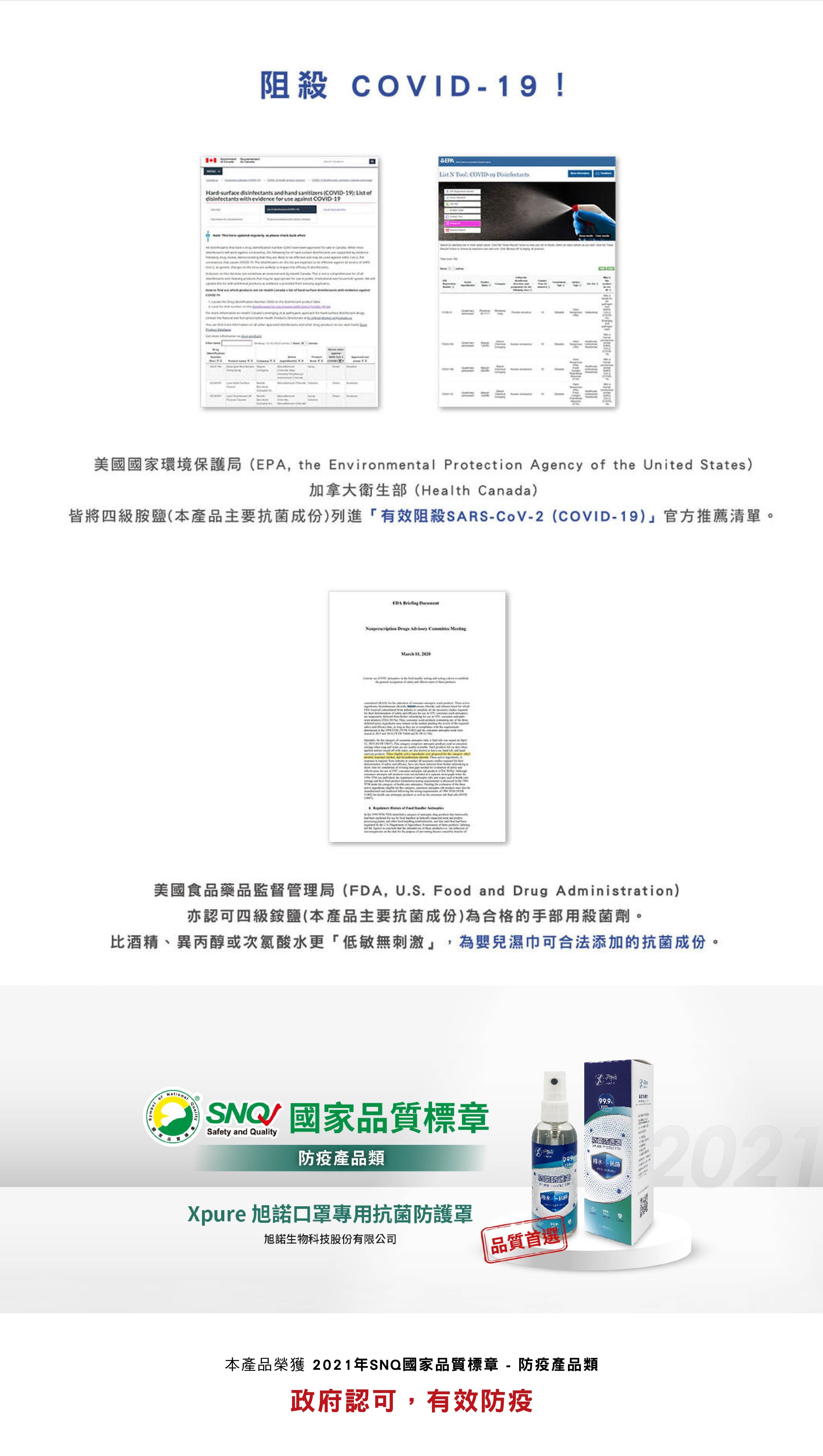 - 榮獲2021年SNQ國家品質標章-防疫產品類。